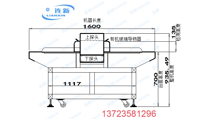 說明:檢針機靈敏度的高低由檢測高度(即通道或龍門)來決定最高檢測精度。龍門越高,靈敏度就相應降低。以上對應的高度和檢測標準是在空機狀態下的檢測結果;檢測通道高度和寬度,都可以按要求定做!